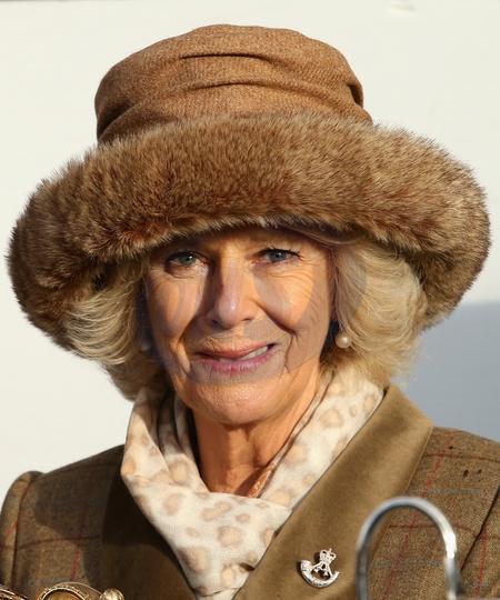 Ksiezna Camilla w kapeluszu z futerkiem na Royal Artillery Gold Cup
