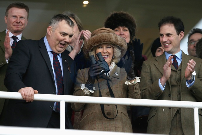 Ksiezna Camilla w kapeluszu z futerkiem na Royal Artillery Gold Cup