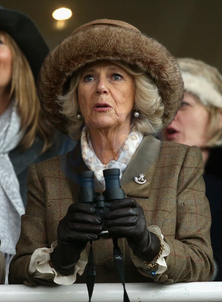 Ksiezna Camilla w kapeluszu z futerkiem na Royal Artillery Gold Cup