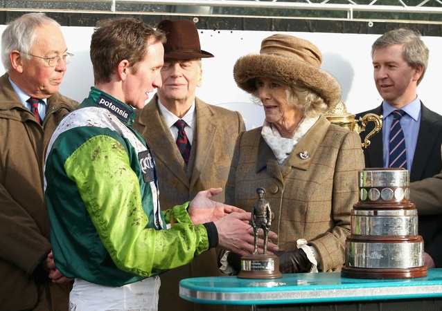 Ksiezna Camilla w kapeluszu z futerkiem na Royal Artillery Gold Cup