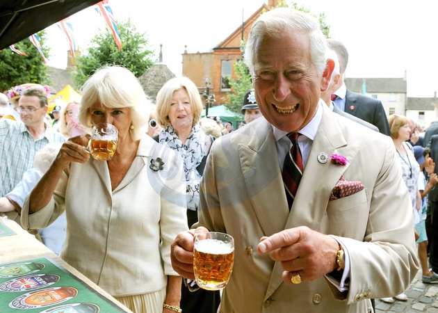 Ksiaze Karol i Camilla pija piwo