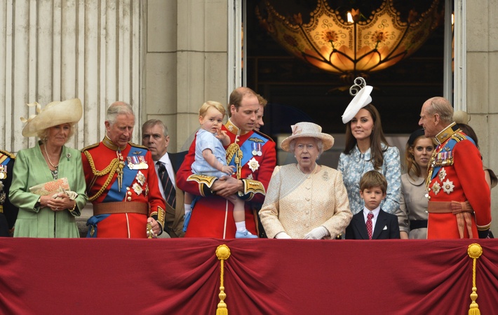ksiezna Camilla, ksiaze Karol, ksiaze William, ksiaze Jerzy, ksiezna Kate, krolowa Elzbieta II, ksiaze Filip, ksiaze Andrzej