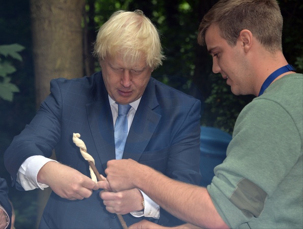Burmistrz Londynu Boris Johnson rozpala ognisko w garniturze i krawacie