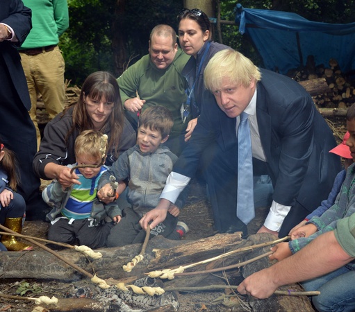 Burmistrz Londynu Boris Johnson rozpala ognisko w garniturze i krawacie