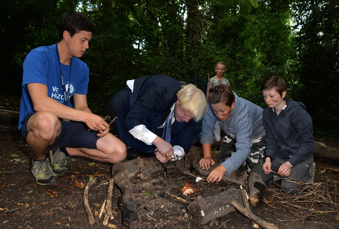 Burmistrz Londynu Boris Johnson rozpala ognisko w garniturze i krawacie