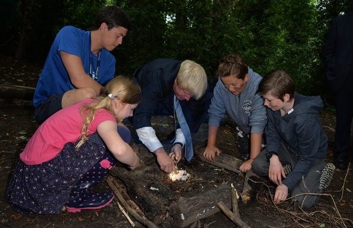 Burmistrz Londynu Boris Johnson rozpala ognisko w garniturze i krawacie