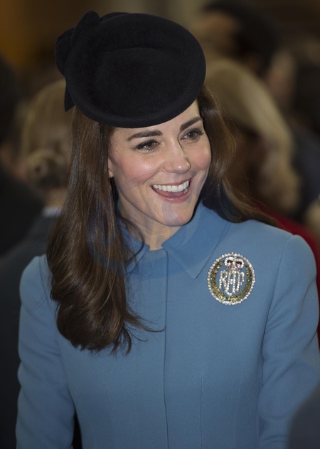 Ksiezna Kate w niebieskiem plaszczyku Alexander McQueen i odznace RAF