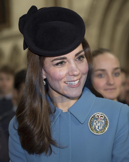 Ksiezna Kate w niebieskiem plaszczyku Alexander McQueen i odznace RAF