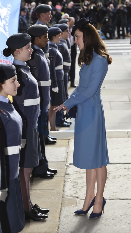 Ksiezna Kate w niebieskiem plaszczyku Alexander McQueen i odznace RAF