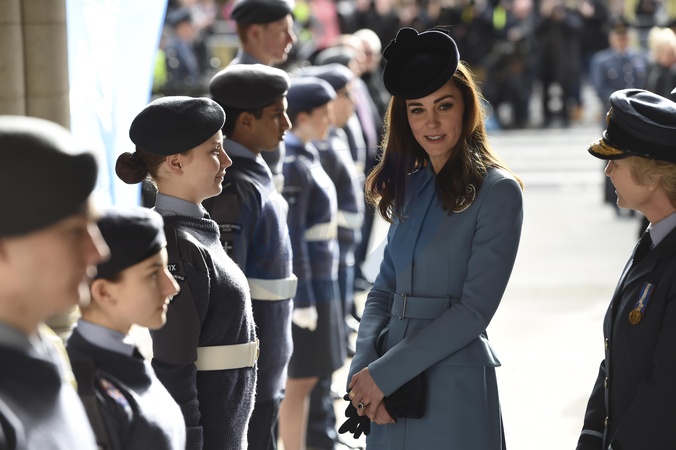Ksiezna Kate w niebieskiem plaszczyku Alexander McQueen i odznace RAF