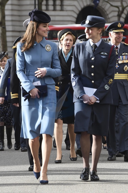 Ksiezna Kate w niebieskiem plaszczyku Alexander McQueen i odznace RAF