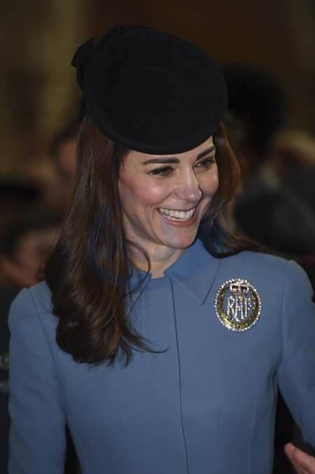 Ksiezna Kate w niebieskiem plaszczyku Alexander McQueen i odznace RAF