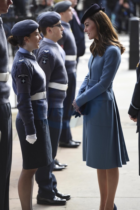 Ksiezna Kate w niebieskiem plaszczyku Alexander McQueen i odznace RAF