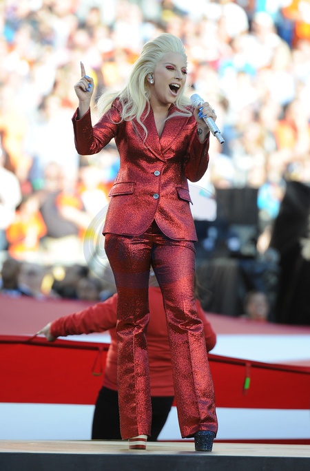 Lady Gaga w czerwonym, blyszczacym garniturze na Super Bowl