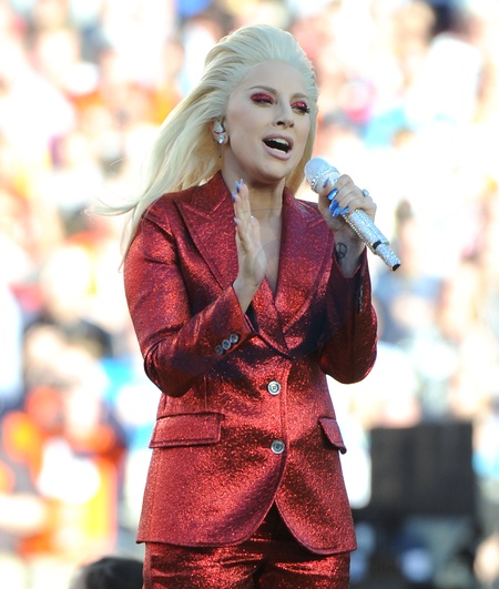 Lady Gaga w czerwonym, blyszczacym garniturze na Super Bowl