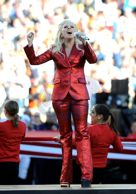 Lady Gaga w czerwonym, blyszczacym garniturze na Super Bowl