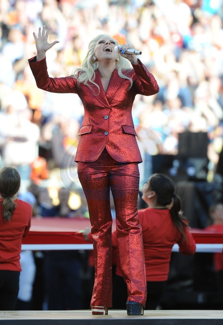 Lady Gaga w czerwonym, blyszczacym garniturze na Super Bowl