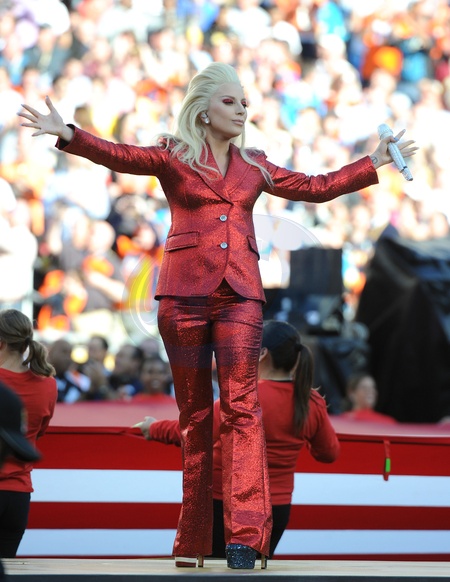 Lady Gaga w czerwonym, blyszczacym garniturze na Super Bowl