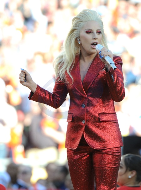 Lady Gaga w czerwonym, blyszczacym garniturze na Super Bowl