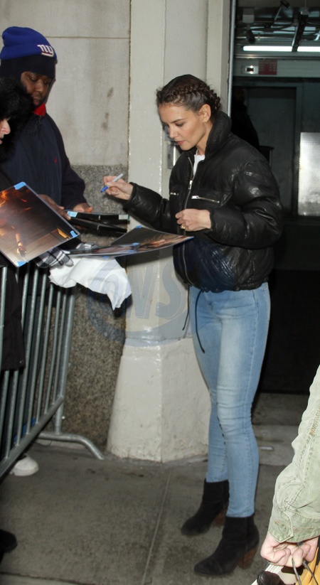 Katie Holmes w czarnej, puchowej kurtce i jeansach