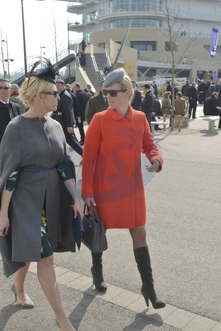 Zara Tindall (Phillips) w pomaranczowym plaszczyku na Cheltenham Racecourse