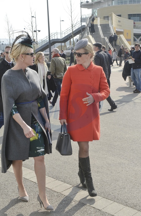 Zara Tindall (Phillips) w pomaranczowym plaszczyku na Cheltenham Racecourse