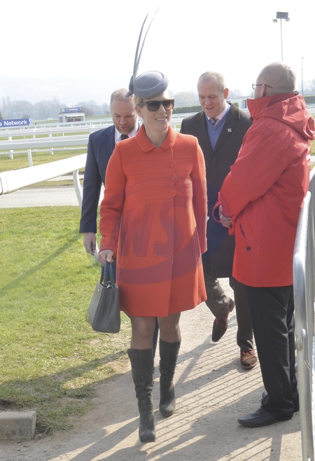 Zara Tindall (Phillips) w pomaranczowym plaszczyku na Cheltenham Racecourse