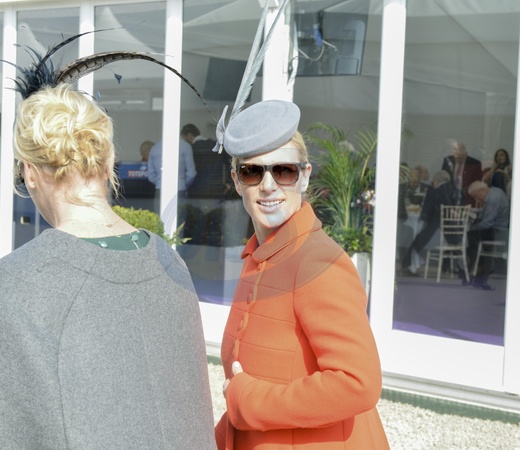 Zara Tindall (Phillips) w pomaranczowym plaszczyku na Cheltenham Racecourse