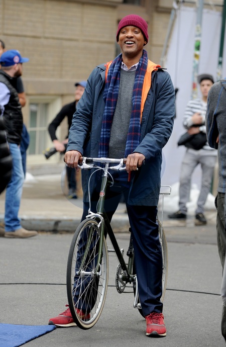 Will Smith na rowerze na planie Collateral Beauty w Nowym Jorku
