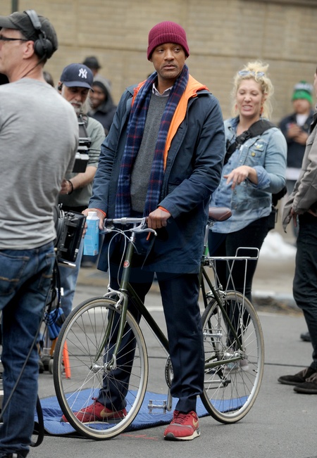 Will Smith na rowerze na planie Collateral Beauty w Nowym Jorku