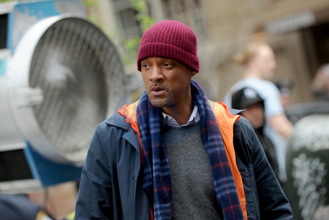 Will Smith na rowerze na planie Collateral Beauty w Nowym Jorku