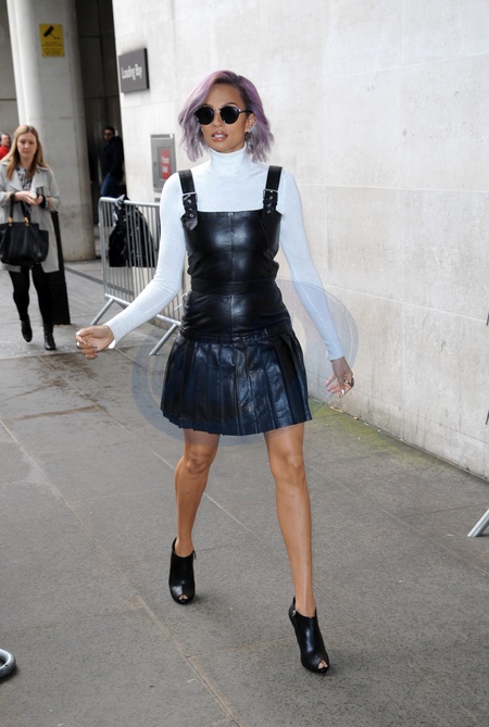 Alesha Dixon w czarnej, skorzanej sukience i bialej bluzce