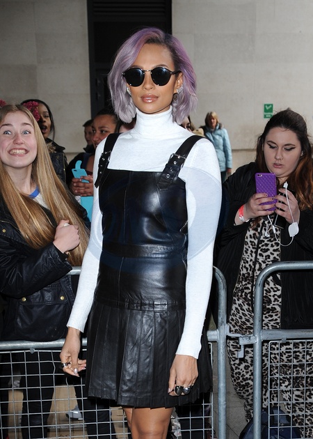 Alesha Dixon w czarnej, skorzanej sukience i bialej bluzce