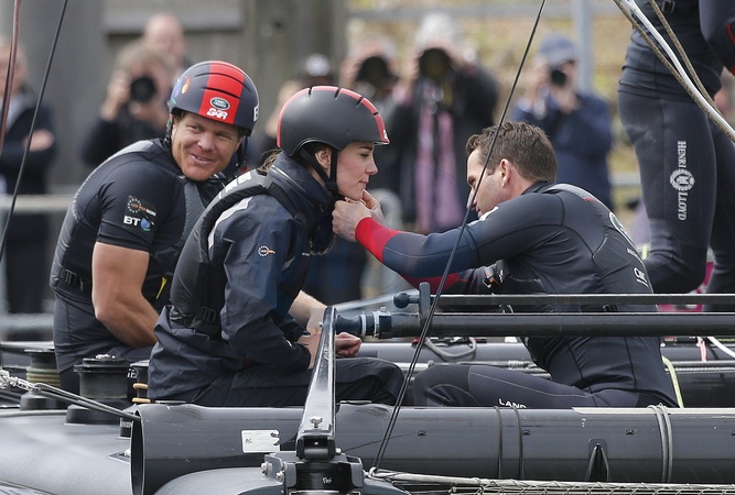 Ksiezna Kate z zaloga Land Rover BAR na ich lodzi szkoleniowej w Portsmouth