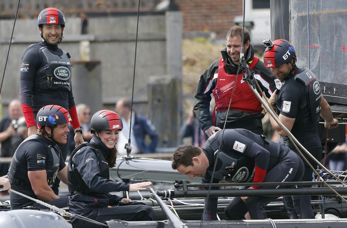 Ksiezna Kate z zaloga Land Rover BAR na ich lodzi szkoleniowej w Portsmouth
