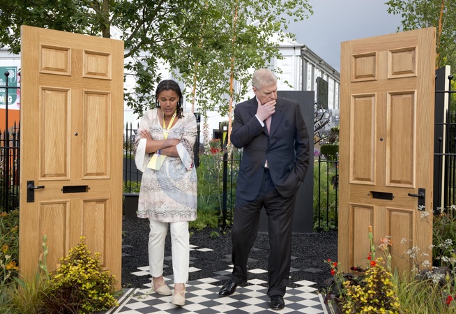 Ksiaze Andrzej z corkami Beatrice i Eugenie podczas Chelsea Flower Show