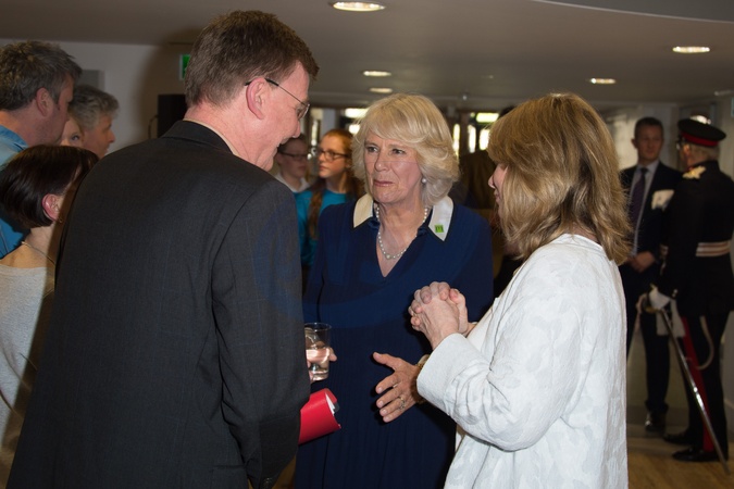 Ksiezna Camilla w granatowej sukience z bialym kolnierzykiem