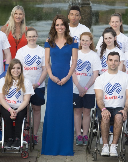 Piekna Ksiezna Kate w niebieskiej sukni podczas SportsAid's 40th anniversary dinner