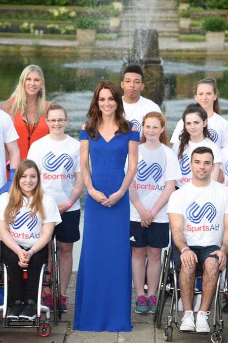 Piekna Ksiezna Kate w niebieskiej sukni podczas SportsAid's 40th anniversary dinner