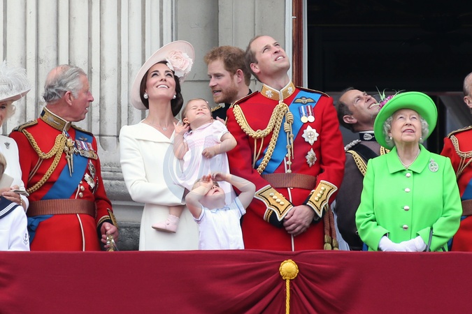 Ksiaze Karol, ksiezna Kate, ksiaze William, ksiaze Jerzy, ksiezniczka Charlotte - Karolina, krolowa Elzbieta II