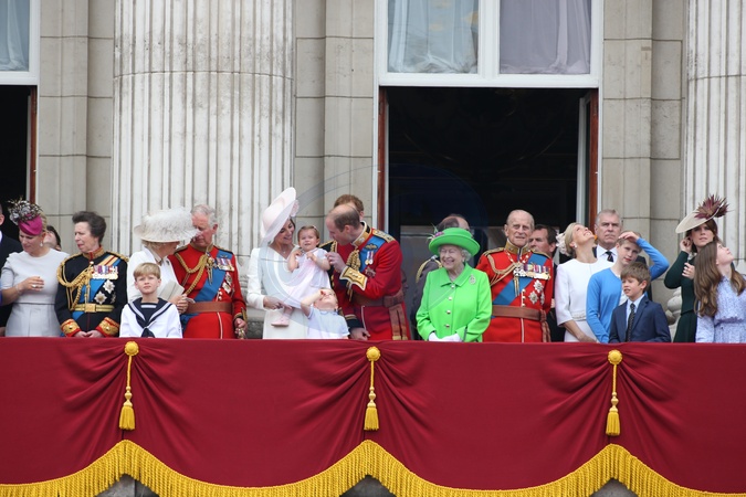 Ksiezna Anna z corka Zara Phillips Tindall, Ksiaze Karol, ksiezna Kate, ksiaze William, ksiaze Jerzy, ksiezniczka Charlotte - Karolina, krolowa Elzbieta II, ksiezna Camilla