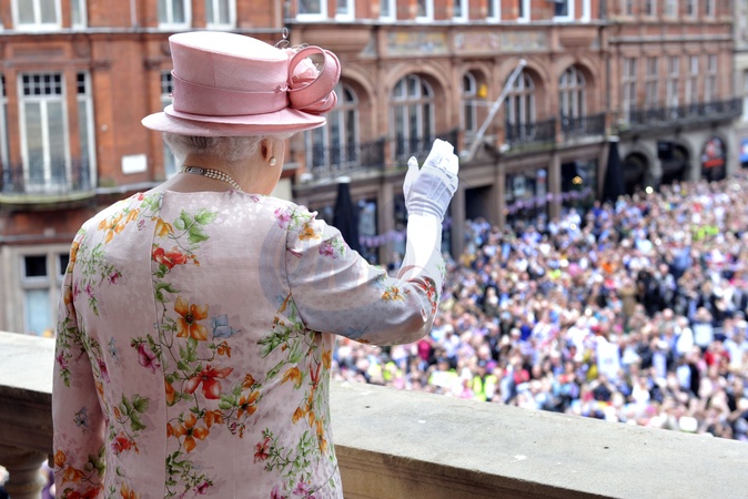 Krolowa Elzbieta pozdrawia poddanych z balkonu