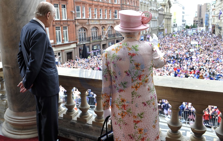 Krolowa Elzbieta pozdrawia poddanych z balkonu