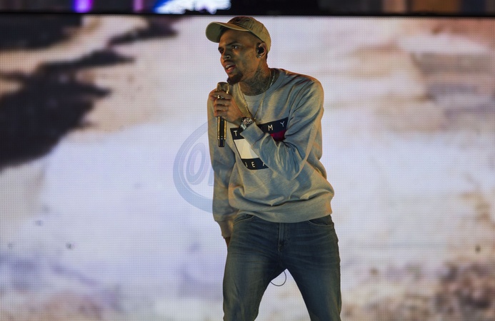Chris Brown w bluzie Tommy na koncercie w Amsterdamie