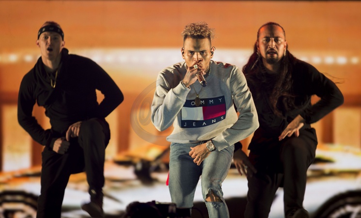 Chris Brown w bluzie Tommy na koncercie w Amsterdamie