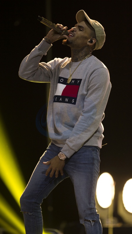 Chris Brown w bluzie Tommy na koncercie w Amsterdamie