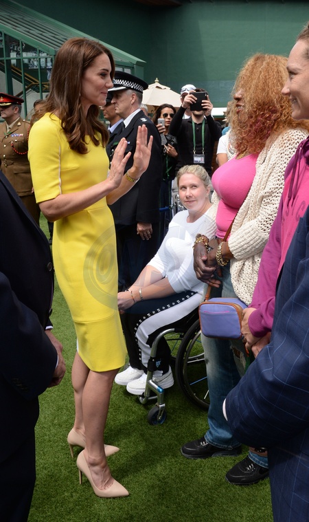 Ksiezna Kate w zoltej, prostej sukience na Wimbledonie