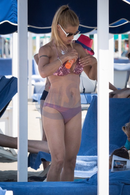Michelle Hunziker w bikini, smaruje dekolt opalaczem