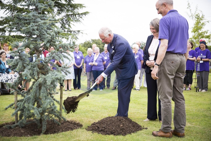 Ksiaze Karol sadzi drzewko w ogrodzie w Bristolu
