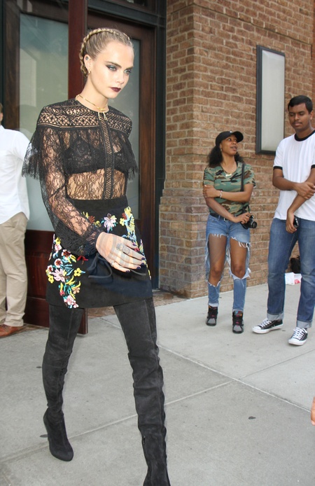 Cara Delevingne w przeswitujacej, koronkowej bluzce
